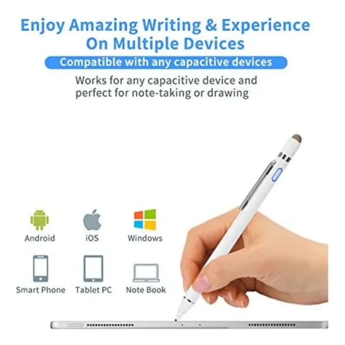 Lápiz stylus capacitivo de alta precisión con punta suave que protege la pantalla, ideal para escribir, dibujar y navegar. Compatible con cualquier dispositivo táctil y equipado con borrador trasero para corregir rápidamente. Su diseño ergonómico es liviano y cómodo, no requiere carga ni Bluetooth. Perfecto para estudiantes, diseñadores y usuarios que buscan precisión y practicidad.